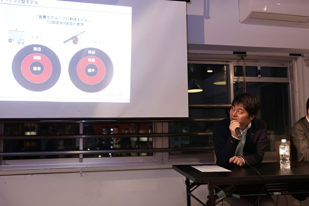 葦原は、球団運営の仕組み、収益分布、経営状況の現状を、図解と具体的な数値を交えながら解説。とりわけ印象的だったのは、入場収入への依存度の高さが、改めてクリアに示された点だ。「なんとなくそうだよね」を「だからこうなる」に変換していく。会場の理解が一段深くなる瞬間が何度もあった。