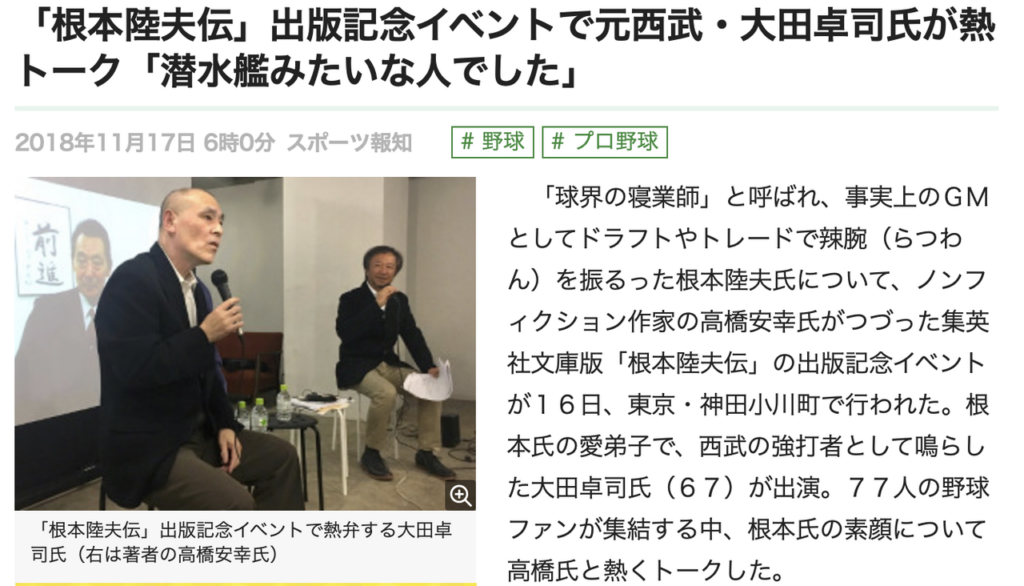 2018年11月16日(金)の夜、『根本陸夫伝〜プロ野球のすべてを知っていた男』(高橋安幸著・集英社文庫)の出版記念イベントが、Creator’s District 神保町にて開催された。